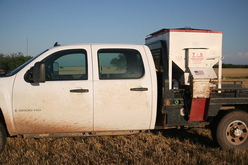 Mike’s truck is equipped with a feed dispenser that he uses to feed his range cattle. It allows him to save money because he can feed in bulk. The truck model feeder is powered by a 12 volt motor that runs off the truck battery. He says he enjoys using it when he needs to move cattle because they hear him open the spout and come running. They know what his dispenser has in it and follow him where he wants them to go.