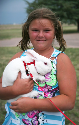 Shanee leads her bunny around the campground like a dog- on a leash. She says that she shows her Poncho for 4-H. Her bunny is not very old but already weighs 6 lbs. You can tell Poncho loves his owner because he cuddles with her.