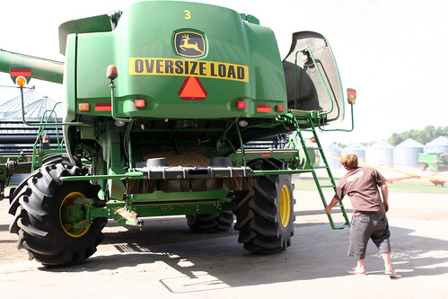 Today Johan and James did some servicing on some of our machinery while the rest of the crew (Callum, Roly, Oak, and Moses) headed west to cut some wheat. They left early to make the 200 mile move. Things are just getting started but they are reporting yields in the 35 to 45 range. I followed Johan and James as they changed the oil filters, oil and gassed up the remaining two machines. Here are some photos of their oil changing efforts. Hopefully these machines will be back in the field cutting spring wheat in the next couple of days.