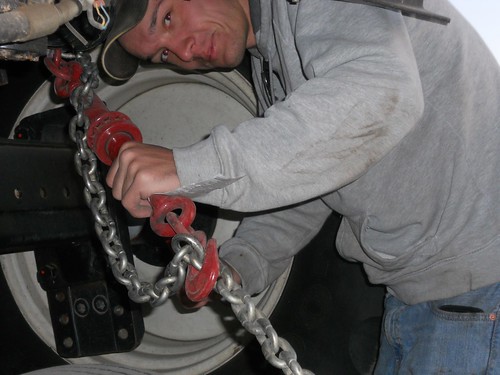 Brandon checks a chain binder during one of our stops. Truck drivers always double check to make sure the load is securely fastened before getting on the road.