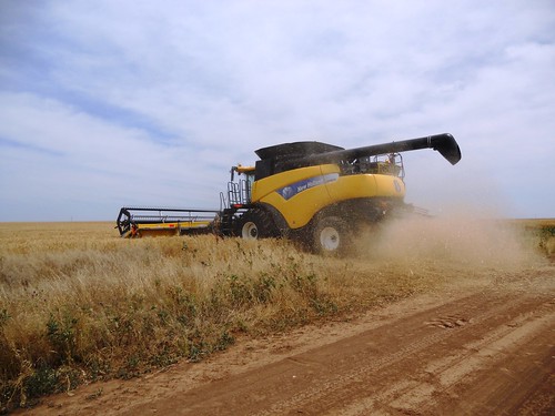 Knowing what a devastating year our farmers had last year we were determined to get out their crop as quickly and efficiently as possible. As the sky filled up with unfriendly clouds in the afternoon and the weather forecast scanned across the radio calling for rain that night we continued to work our little hearts out. The elevator in a nearby town, Eldorado, closed down at 11 that evening but we were determined to cut out as much wheat as possible. Even after the elevator closed down we were in hopes of filling both of our grain trailers and the grain cart before the rain set in. Luckily, we were able to almost fill two of the trucks before the rain got the best of us as it set in around midnight. Unfortunately, we were shy of about 40 acres from finishing that field as heavy rains pounded the area. Overall, it was a successful first day of harvest!