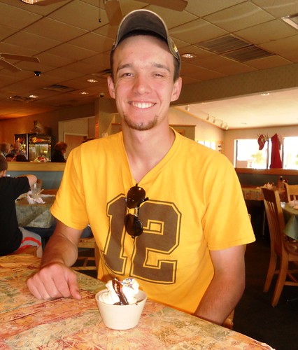 Happy Birthday “little” brother! Brandon enjoys an ice cream sundae after his birthday lunch today. Usually his birthday is spent working in the field with milkshakes or cake to celebrate. However, the recent rain is hindering our cutting today. This afternoon Brandon will be loading up his combine to head over to Perryton, Texas while the rest of the crew finishes up near Helena, Oklahoma.