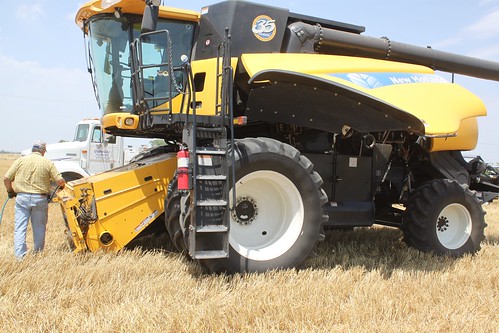 With the late harvest last summer, we were forced to skip this stop here in Lyons and move up to our stop in northwestern Kansas. We have had this job since 1997 so it was hard not to feel like something was missing! The first two fields we cut this afternoon/evening had some of the best wheat we have seen so far this summer. Yields were showing between 45-50 bushels, test weights at 64 pounds, moisture at 10-11% and protein at 10. With numbers like that, we are feeling very welcome back here. We have about a 40 mile trip to our elevator so we had to have Mom out in the field today as well in order for the trucks to keep up with this beautiful wheat.
