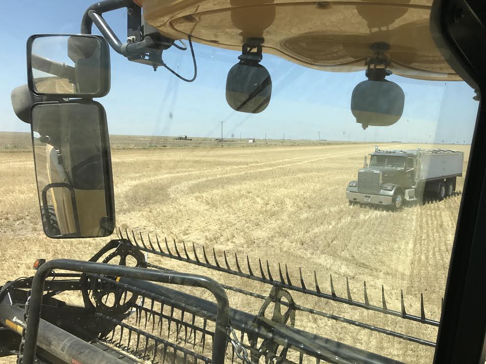 We put in a good first day! Considering the field is about as flat as flat can be and I didn’t make many turns, I was able to cut 170 acres. Poor Jim, though, he was literally driving trucks all day. There was no break for the truck driver! According to the yield monitor, this field is making 35 bushels per acre – better than expected. Our farmer said it was terribly dry over the winter, and the wheat nearly died (remember… wheat has to die at least 7 times before it’s harvested). But, then it rained in January (which he said never happens) and that saved the crop. According to Jim, the test weight has been staying at 62 pounds.