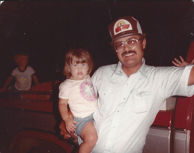Janel and Dad in a wheat field on a harvest route in the 1980s. My Dad always has the best summer tan. Photo by Carlene Schemper.