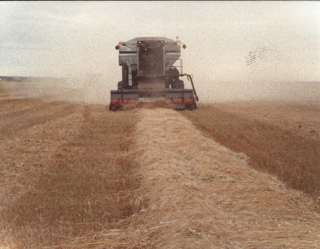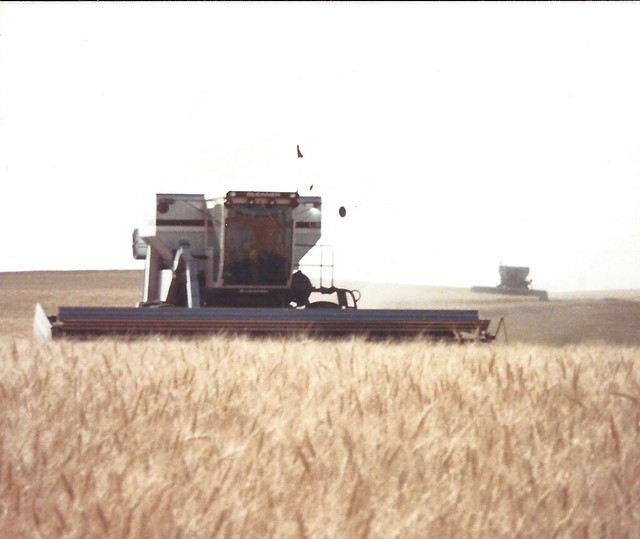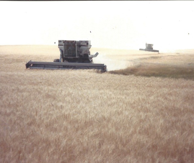 Schemper Harvesting back in the L2 Gleaner days. LaVern Schemper is pictured running combine, picking up wheat. Photo by Carlene Schemper.