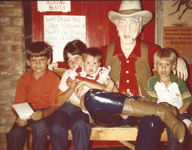 Four Schemper kids taking a picture with the cowboy statue in Wall Drug, South Dakota along our harvest route. Pictured are JC, Julie, Janel and Jared. Photo by Carlene Schemper.