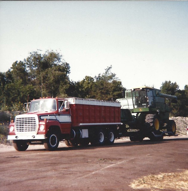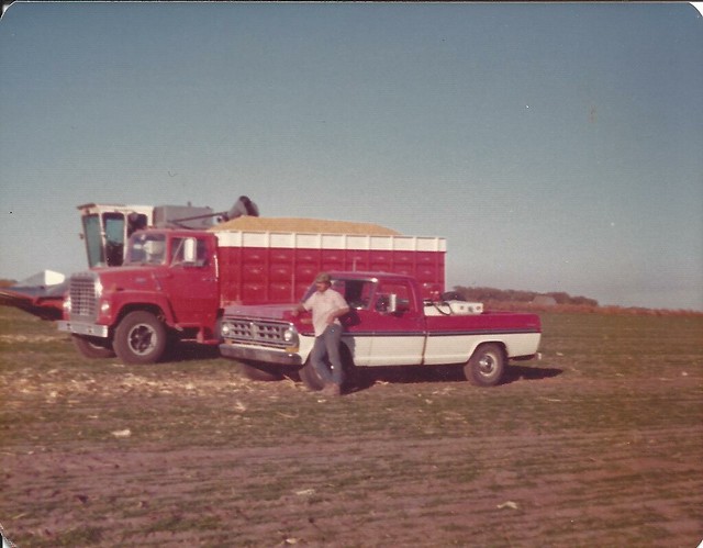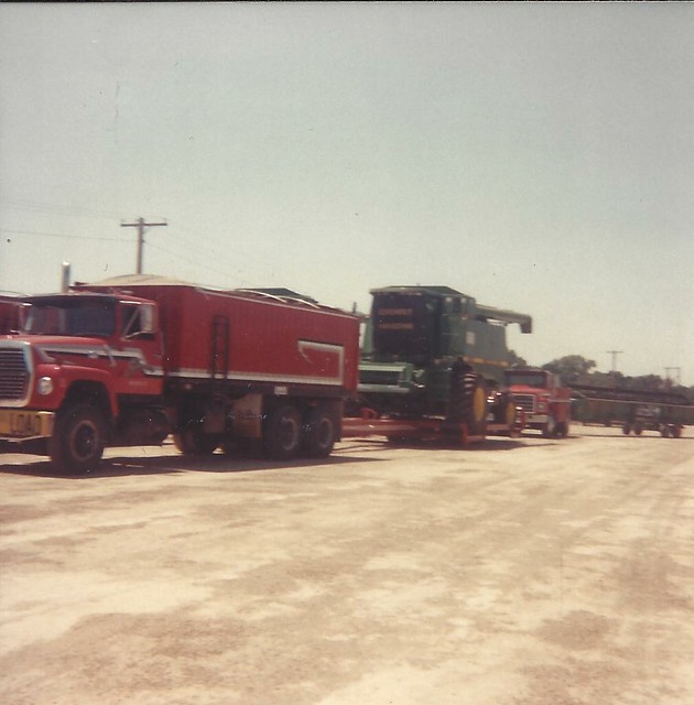 My Uncle, Lonny Schemper driving his truck and hauling his combine in the 1980s. Photo by Carlene Schemper.