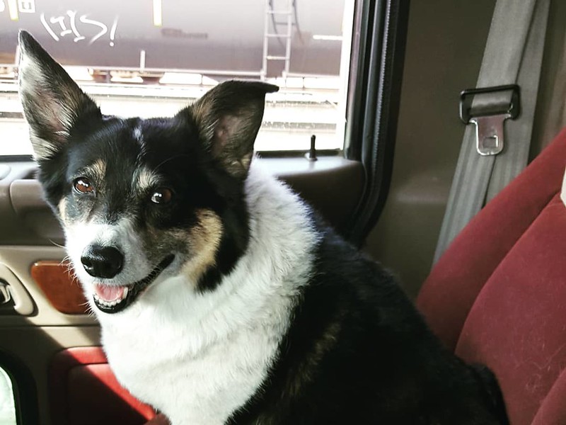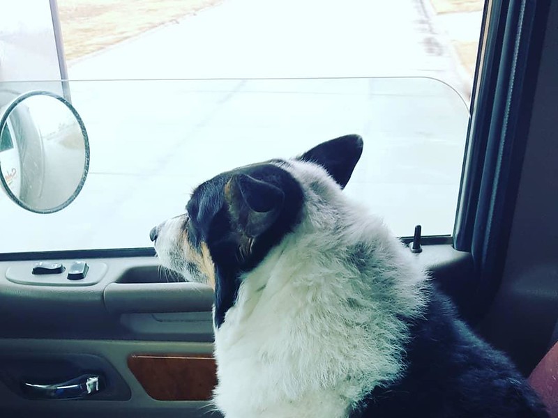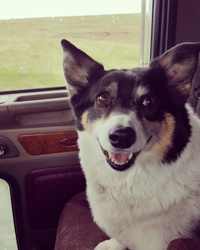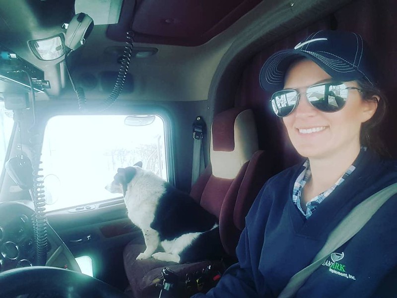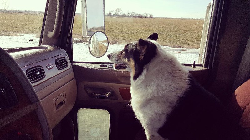 Miss Moo loves truck rides too! This is how we spend our winter, aka harvest off-season. Photo by Janel Schemper.