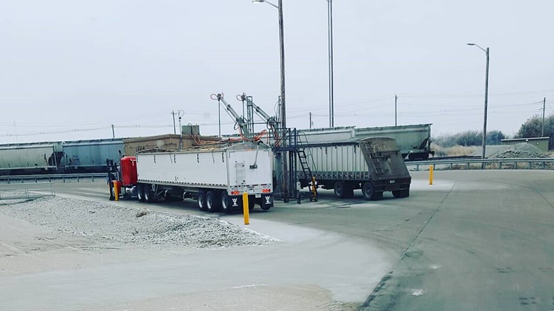 My dad’s truck on the left. Thankful for electric tarps on our trailers. Photo by Janel Schemper.