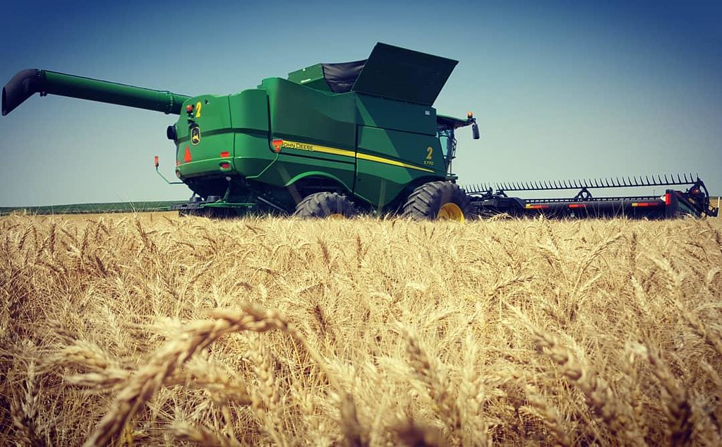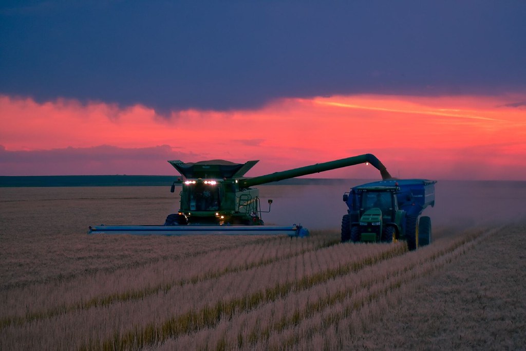 JC Schemper cutting wheat in Montana 2018. (Photo by Tricia Schemper.) All of these photos demonstrate the iconic John Deere green and yellow colors.