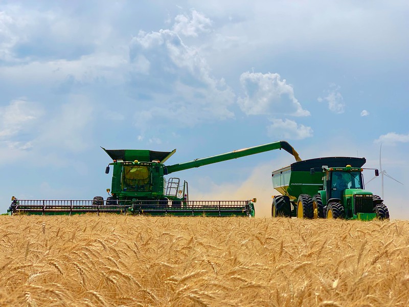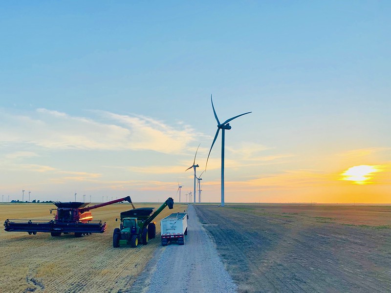 Wheat and wind turbines … working together to provide our country food and fuel. Would you like to see them up close? Maybe ride along in the combine and check out a unique perspective few get to see? I can help you with that … just click the video link below and take a few minutes to tag along with the crew in the field. Why tell you about it when you can see it for yourself? Enjoy the view!