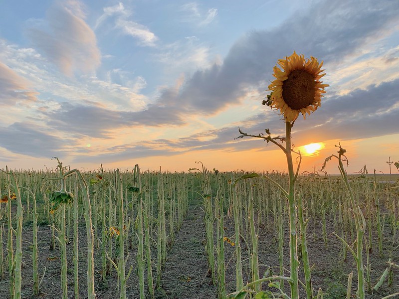 Sunflower fields were stripped of their leaves, the brown soil turned green from tattered leaves stripped by the hail. Other fields were blown flat by high winds. Thousands of acres were a total loss.