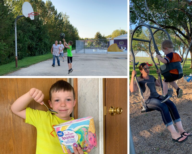 Titus shoots some hoops with Glen and Cameron at the park, while Brenda tries out the swing set with Canaan. Ezra demonstrated the proper way to eat unicorn sparkle ice cream with magical purple frosting swirl. It has proven to help lift the crew’s spirit during our rain delays. Whatever it takes, right?
