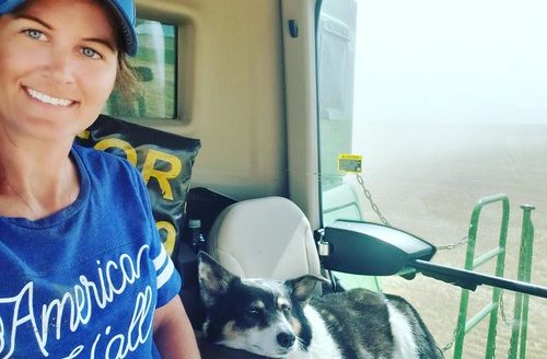 Miss Moo and I just arriving in Oklahoma for wheat harvest 2020! Check out that golden wheat and Miss Moo’s smile! She loves truck rides, fresh air and wheat harvest! Photo by Janel Schemper.