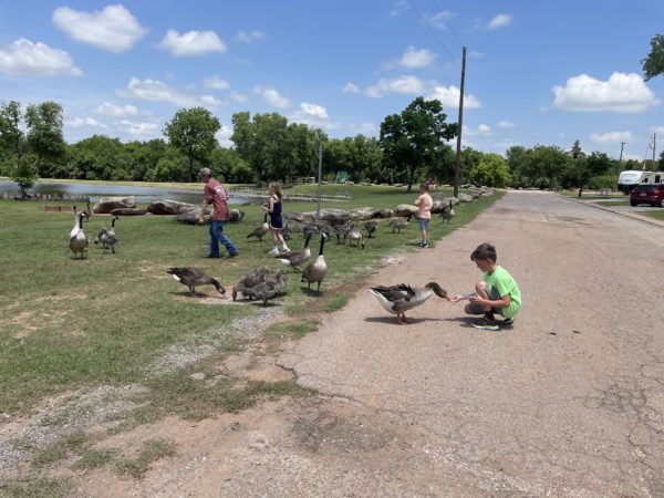 At the campground there’s a pond where she can also feed some abnormally friendly geese and ducks. The Schemper boys came to visit after the U.S. Custom Harvesters Safety Day Meeting and fed these geese, too. I think they enjoyed it. Zoey loves getting to see Sunder, Sage and Sterling. Our harvester friends help make some very special memories over the summer. The crew has also enjoyed fishing at the pond.