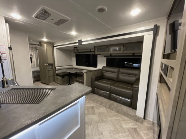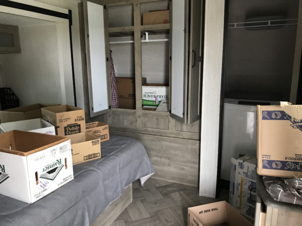 Three slide outs with two private bedrooms—one in the front, one in the rear—means a really big upgrade in our living accommodations. This floor plan included a ton of open storage space to hold a summer’s worth of stuff. Once we’re settled in, I’ll give you an official tour of the inside.