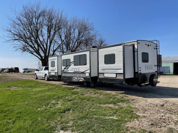 The weather has been wonky this spring, but we won’t complain about a little extra time here at home. There is always plenty to do, but we added two more time-consuming projects this year. We are excited to have upgraded our living quarters this year, with David purchasing a new travel trailer. This is only the second new trailer we have had in our 38 years of living on the road, so it’s a pretty exciting purchase. Finding a floor plan that can accommodate David, Cameron and Brenda and their four boys took quite some research, but we were able to custom order a new 32 foot-long Palomina Puma that has three push outs and two separate bedrooms. That’s a huge increase in living space square footage and we are excited to have such an upgrade in accommodations.