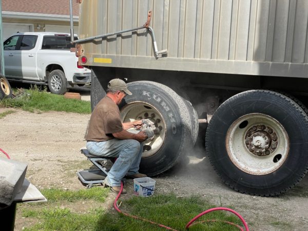 Leave the farm behind for three months means a lot of planning, and getting harvest equipment field-ready takes a lot of time. Cameron works on removing the corn concaves on the combine while Brian inspects every hose and pulley in search of something in need of preventive maintenance. Glen works on annual semi truck DOT inspections, checking brakes and tires to make sure we are ready to safely tackle the thousands of miles that lie ahead.