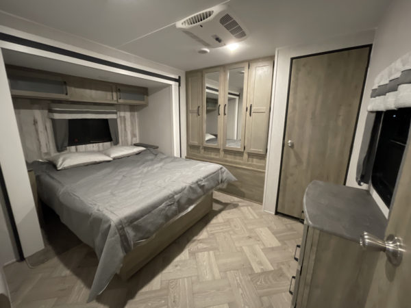 Three slide outs with two private bedrooms—one in the front, one in the rear—means a really big upgrade in our living accommodations. This floor plan included a ton of open storage space to hold a summer’s worth of stuff. Once we’re settled in, I’ll give you an official tour of the inside.