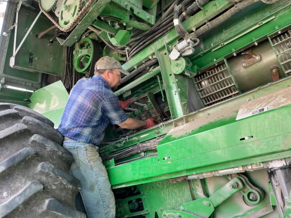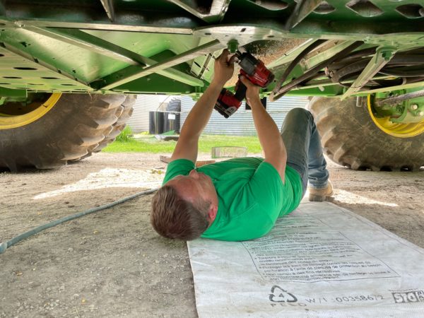 Leave the farm behind for three months means a lot of planning, and getting harvest equipment field-ready takes a lot of time. Cameron works on removing the corn concaves on the combine while Brian inspects every hose and pulley in search of something in need of preventive maintenance. Glen works on annual semi truck DOT inspections, checking brakes and tires to make sure we are ready to safely tackle the thousands of miles that lie ahead.