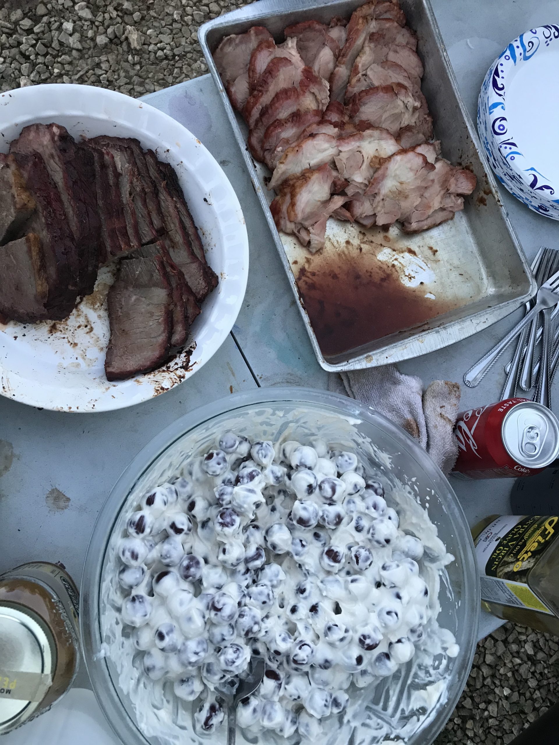 This shows some of the meat the crew smoked and, back by popular demand, the grape salad I made per request.