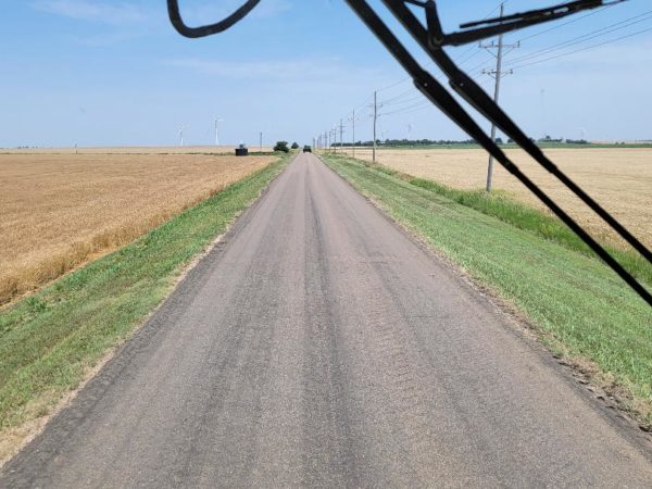 Pratt, Kansas–We arrived in southern Kansas on June 18. It was a hot 105 degrees F the day we moved. We had to travel slower because it was so hot outside. We traveled highways 183 and 281 and a lot of wheat had been cut the whole way up until about the state line area. Here at Pratt the wheat harvest was just getting started. We unloaded and went to the field and our first three loads went 14.0%, 13.2% and 11.4%. We were right on time and have been staying very busy cutting wheat.