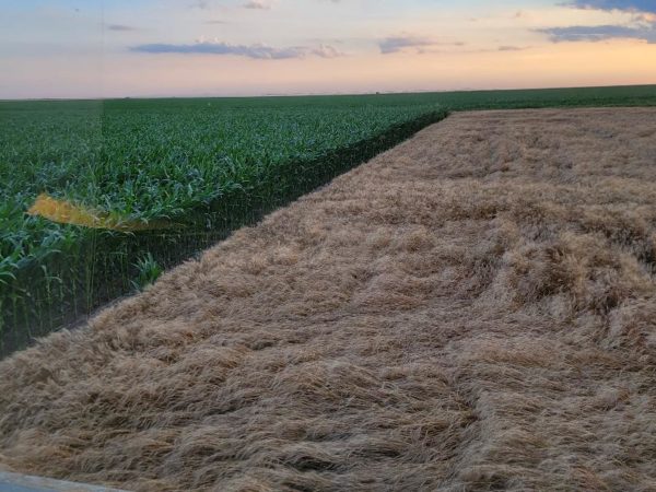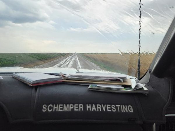 Western Kansas–We’ve been rained out three times while we’ve been harvesting wheat in western Kansas. Some of the wheat has been laying flat on the ground. The conditions haven’t been the greatest while we’ve been here trying to get the wheat harvested. While combining, the dirt and dust just flies. The combines are filthy from all the dirt, dust and rainstorms.
