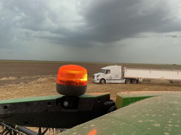 We harvest in two locations here, separated by approximately 50 miles. Our house trailers are parked in Minneola, but our acres in Sublette seem to have ripened a few days sooner. The next morning we move machines west to get started. We unload the combines and get right to work. The wheat looks beautiful here, with a thick stand of plants that ensures a big yield. The first few loads to the elevator indicate we are looking at 50 to 80 bushel wheat this year, and that’s pretty exciting after experiencing repeated droughts over the last few years. As the sun descend towards the horizon on our first day of harvest here it disappears prematurely behind a bank of dark, threatening clouds. There will be no silver lining this time.