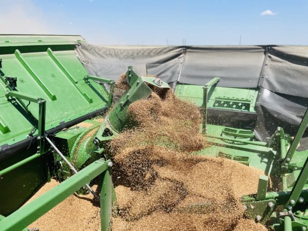The following day is a preview of the weather we will experience for the next 12 days. Cloudy skies, high humidity and highs in the low 80s is the new normal, and we sit for two days unable to run. Another glance at the trusty weather app indicates we could be in a holding pattern indefinitely. With a crop this nice you can’t risk waiting forever, and the decision is made to run if the moisture stays under 16%. Elevators don’t normally take wheat this wet due to long-term storage concerns, and if they do there is a drying cost charged to the farmer. It’s a small price to pay with yields this big and market prices this high. Rain clouds and sprinkles taunt us as we finish in Sublette, and we never deliver another dry load of wheat after that first day.