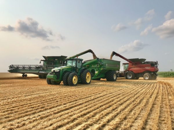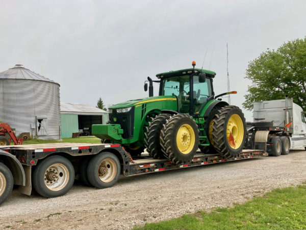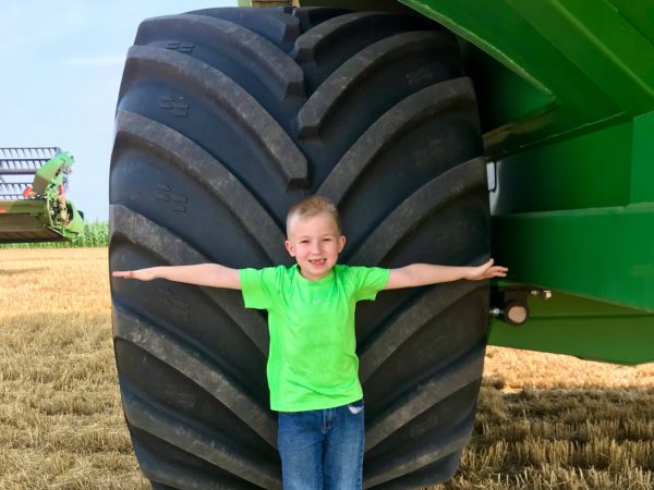 Glen piles on the miles and hours for a quick round trip to Iowa to retrieve the tractor, while Brian pickups up the rented grain cart to help manage all those mile-long rows we will be harvesting. Judah is all smiles as he demonstrates just how big the tires really are on a 1,450-bushel capacity grain cart. They are tires a monster truck would be jealous of.