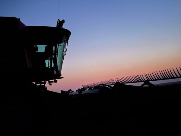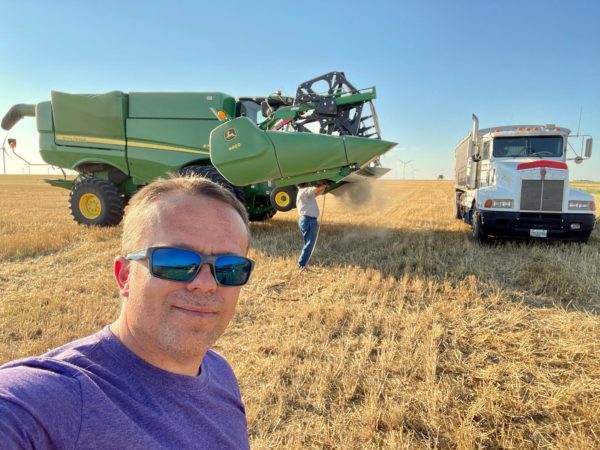 Grassy waterways cut through the golden wheat like a river of contrasting color. Harvest begins with perfect weather conditions and long days. Brian’s not pumped over pumping diesel at midnight but it’s the sign of another productive day.
