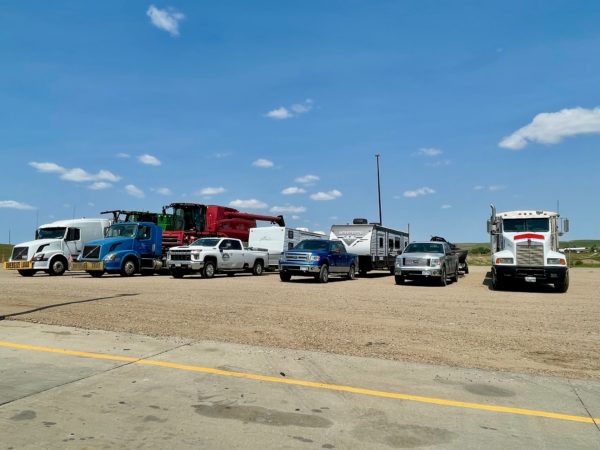 We arrive in Onida, and we are only the third crew to set up camp in the trailer park. A lot of crews we expect to see here haven’t arrived yet, undoubtedly still working feverishly to finish harvesting down south. It’s hot, and the crew is weary from our two days of traveling at lot of narrow roads with our wide loads. But we won’t get a break today. We hurriedly unload equipment in the afternoon and start harvesting yet that evening.