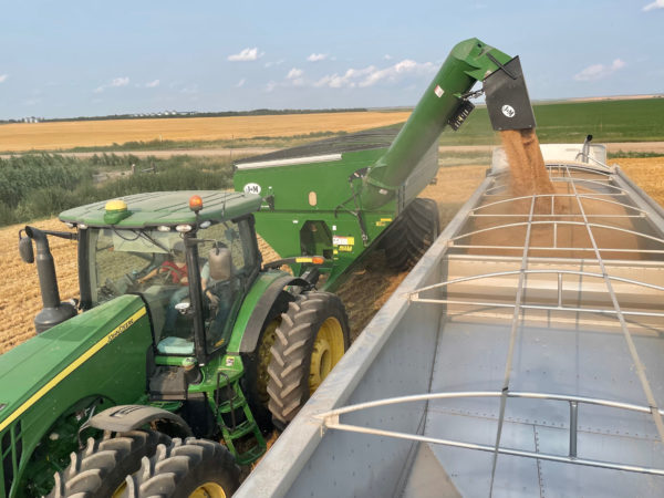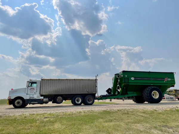 It’s the prefect opportunity to get our tractor and grain cart situation resolved. We normally have a few days when we arrive to head back to Iowa to get equipment brought up here, but not this year. Glen makes the long drive back to Iowa, loads the tractor, and heads back to Onida the next morning. Brian takes the truck and picks up a grain cart we have rented from 75 miles away. We spend the morning unloading and hooking up the cart, and that afternoon we are back harvesting in mile long fields.