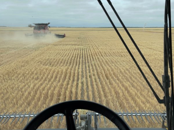 We have one combine at home to do our local farmers and our own crop, but have not been able to get a good start. We took one truck in to the elevator and the moisture was 15.5% and averaging in the single digits for bushels. The drought has definitely had a huge impact on most of the crops here in North Dakota.