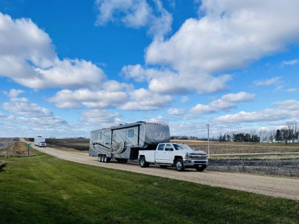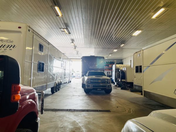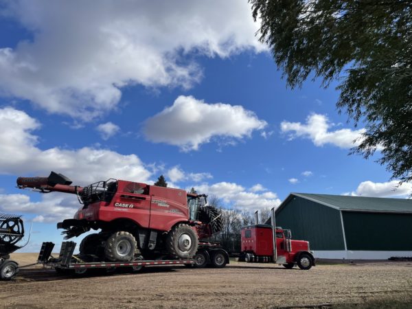 Our Elkton crew pulled in on Thursday, bringing a combine, service truck, and two more campers home. They pulled the campers into the shop right away since we had snow and freezing temperatures in the forecast.