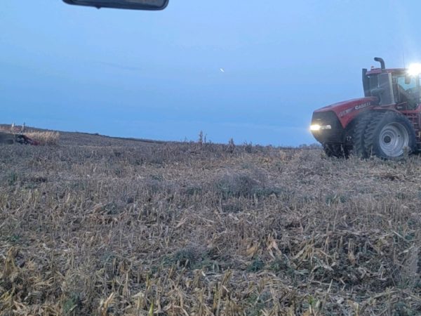 Roger’s crew finished in Grant, Nebraska, and headed home with one semi and the corn head. Just as they pulled in, they were told to get that corn head unstrapped and get it on the third combine as they were going to combine all night. So, we then had three combines running on Roger’s corn but the rain came in around 3:30 a.m. but it wasn’t until 5:30 a.m. that it was too much and they were forced to stop with only one field left. They got everything moved up to the farm and put in the shed so it didn’t freeze and Mychal took the guys to Bowdon for breakfast. Once they finished, they all went to bed for the day. We are so grateful to our employees for pushing through the night to help us get a majority of the corn off.
