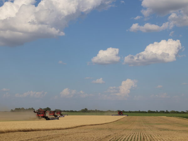 Four combines moving through a field by Pratt, Kansas, yielding around 40 bushels per acre.