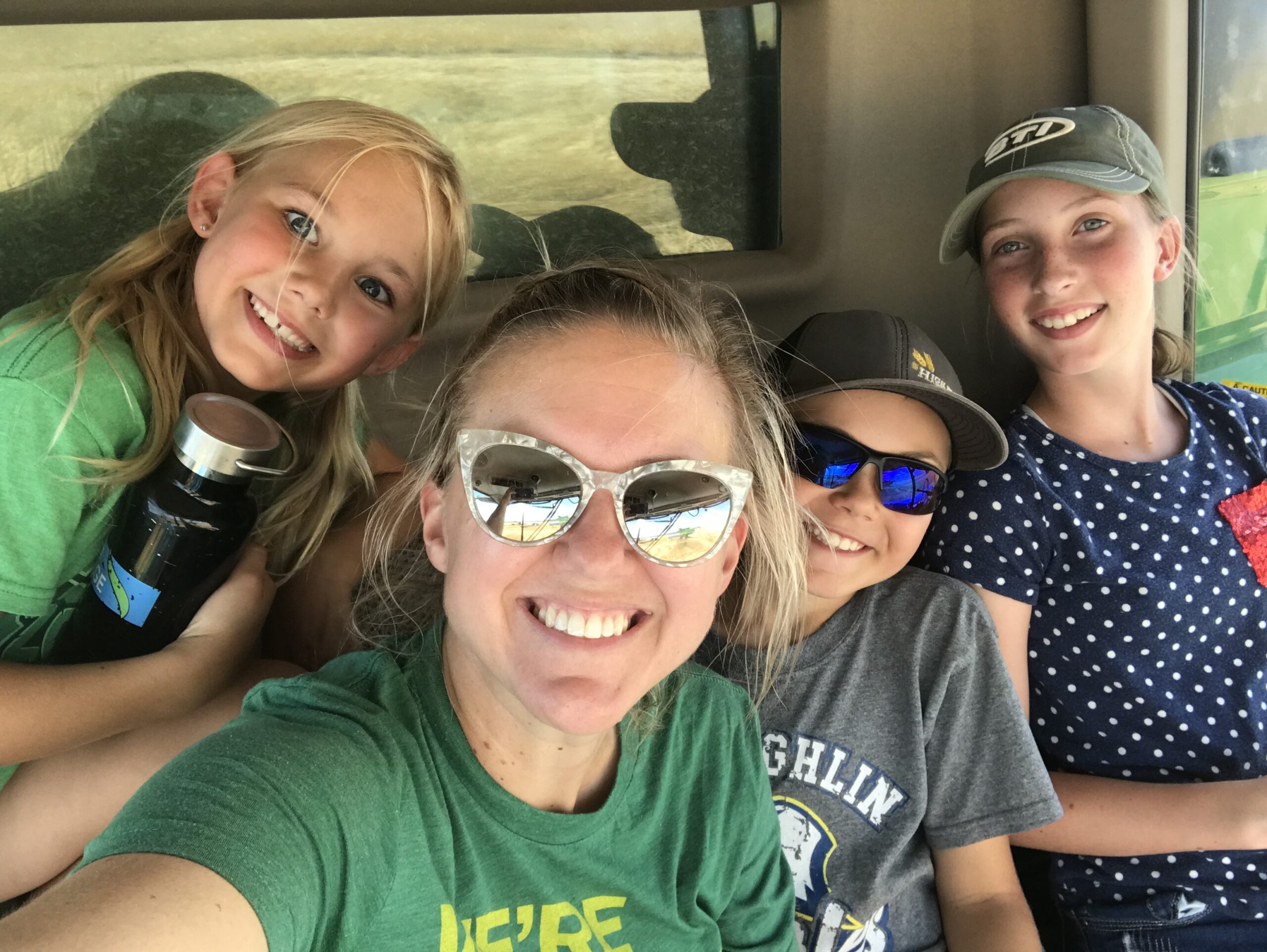 Yesterday we had a nice surprise at the field. One of Ryan’s sisters and nephew stopped by for a visit and brought another sister’s daughter to the field. That was a bit complicated—he has a huge family. Little Man and Lady A were thrilled to see them and were especially excited to take their cousin for a ride in the combine. We commandeered one from Isaac and away we went. I can tell you, our days of packing into a cab like that are numbered. We’re running out of room for everyone’s growing, lanky legs and arms.