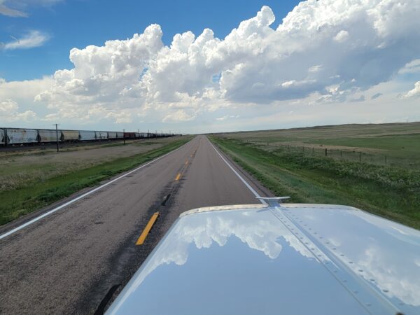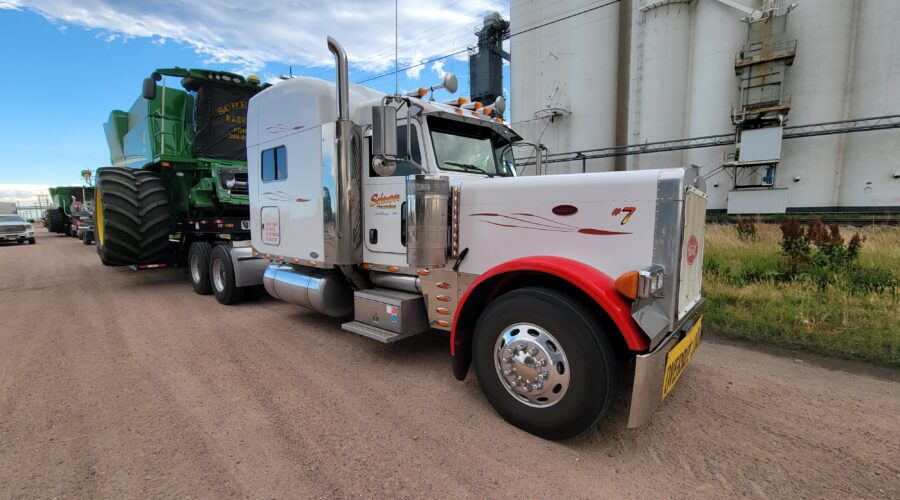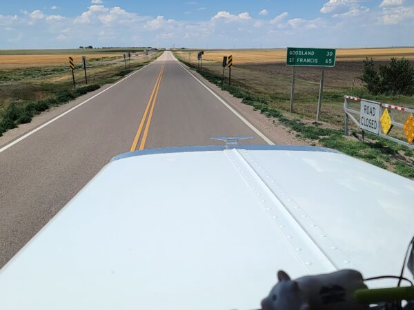 Moving north on July 4. I dislike hauling combines up the narrow highway from Tribune to Goodland. I wish it were wider.