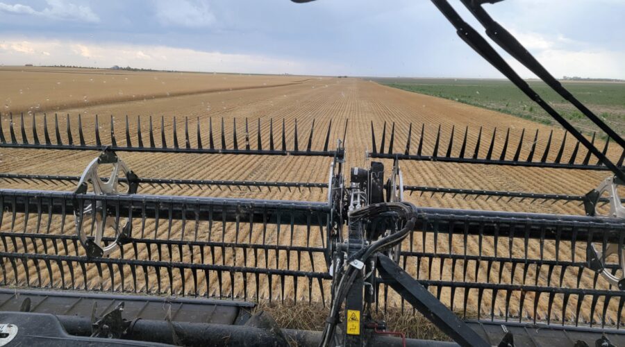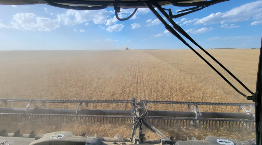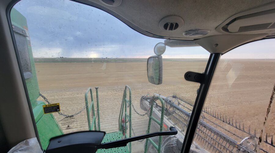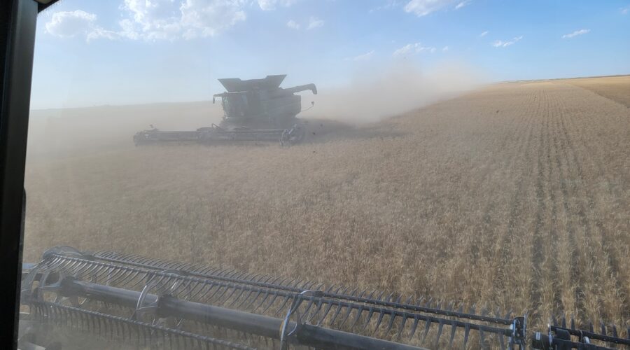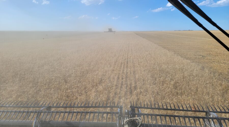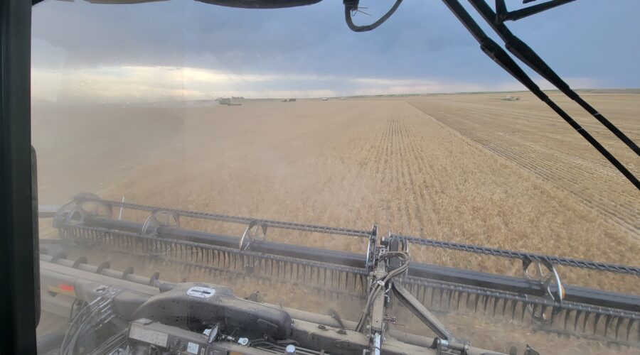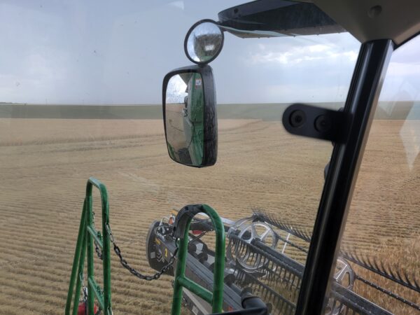 We’ve been busy cutting wheat but haven’t had the best harvesting conditions. There are soft spots and mud holes in the fields. If we didn’t have four-wheel drive, we wouldn’t be able to completely cut the fields. We’ve also been dealing with sawfly. That’s when the wheat stalk is broken and the wheat lays flat. Therefore, we’ve been cutting the wheat very close to the ground and not leaving much stubble. The wheat in this area also had freeze damage and the yields are lower, averaging around 20 to 30 bushels per acre.