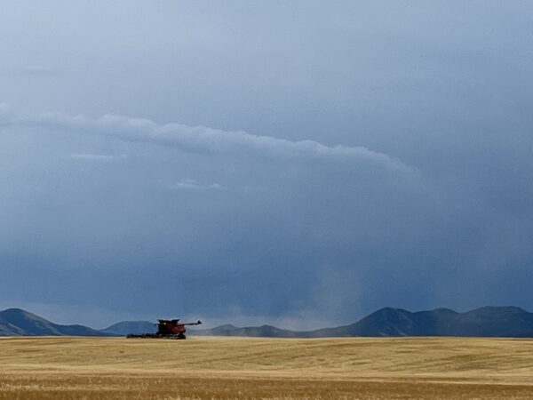 When Paul’s group finished up the windrows that were ready, he moved two combines to join the Carter crew and moved just his combine over to work on a field of camelina. Camelina is a crop that’s similar to flax. Before Paul could finish the field, a storm cloud came up from Great Falls and rained him out. It never seems to do that out here, but it was good to get a little rain. He said from what he could tell so far, the camelina wasn’t averaging very well. We’ll have to see when he finishes the field.