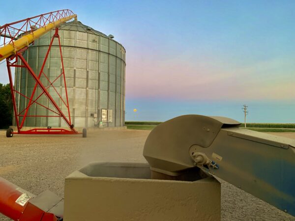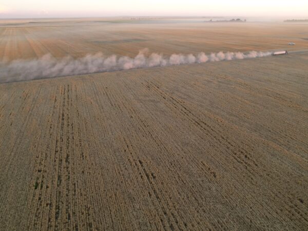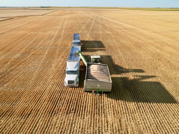Brenda arrives with 1,400, ready to send the next load to the bin. The shadows foreshadow the evening harvest hours that are about to begin.