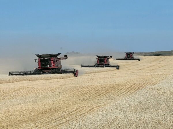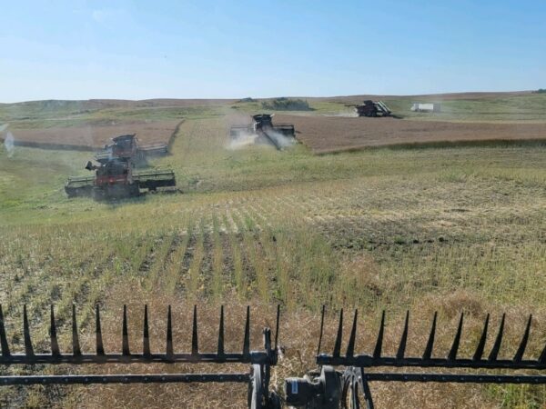 We have crews in Langdon, North Dakota, with three combines, Westhope, North Dakota, with three and Donnybrook, North Dakota, with five combines cutting durum, spring wheat, barley, and canola. We finished our own barley and our farmers around home before heading to these jobs. We have not planted barley on our farm in 10 years and this year we decided to give it a try and it ran 70 bushels an acre.