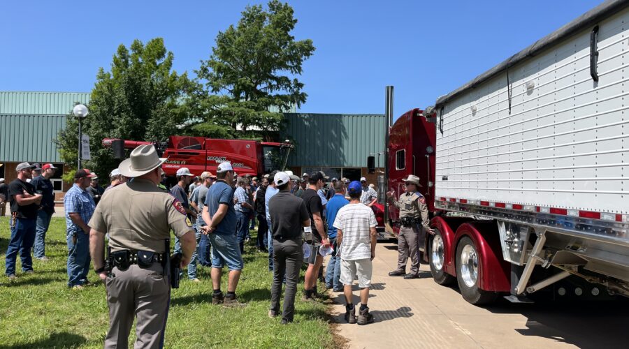 The rain delays haven’t been all bad. U. S. Custom Harvesters, Inc. put on an excellent Safety Day in Wichita Falls on Wednesday. We were happy to be one of 220 people to attend. Once again this year, we brought over a combine with header and semi with trailer for some of the safety and regulation demonstrations. Even though one of the very awesome Texas State Troopers did indeed point out a couple of missing reflectors. As always, a lot of important information was addressed that I believe is so very crucial, especially to first year crew members.