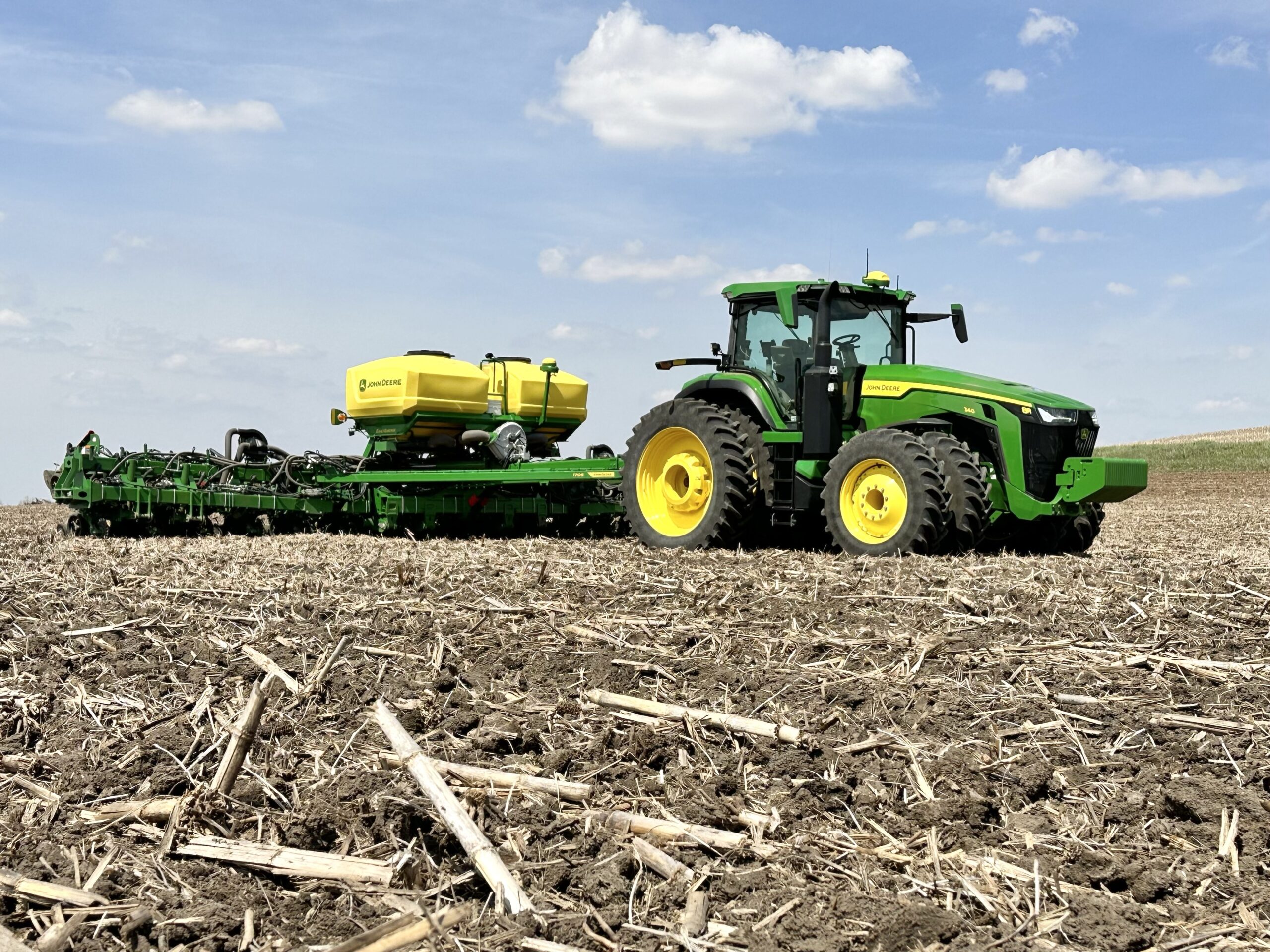Planting even had a wheat harvest connection this year. We’re very excited to have upgraded to the latest generation of John Deere 8R series tractors, but actually finding a tractor available proved challenging. Equipment dealers are still suffering from inventory shortages and long order times due to supply chain issues. When we couldn’t find exactly what we wanted locally we made a phone call to our dealer in southwest Kansas where we purchase our wheat headers from. It ended up they had a low hour, used tractor that was exactly what we were looking for, and a week later it was hauled up to Iowa. I couldn’t help but chuckle when it arrived seeing some wheat straw still crammed in some of those “impossible to ever get clean” places, and it’s fun to think maybe we saw this exact tractor in the field working while harvesting wheat last year in Kansas.