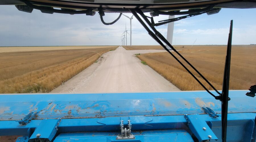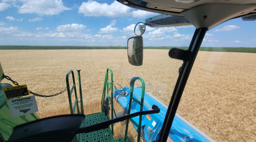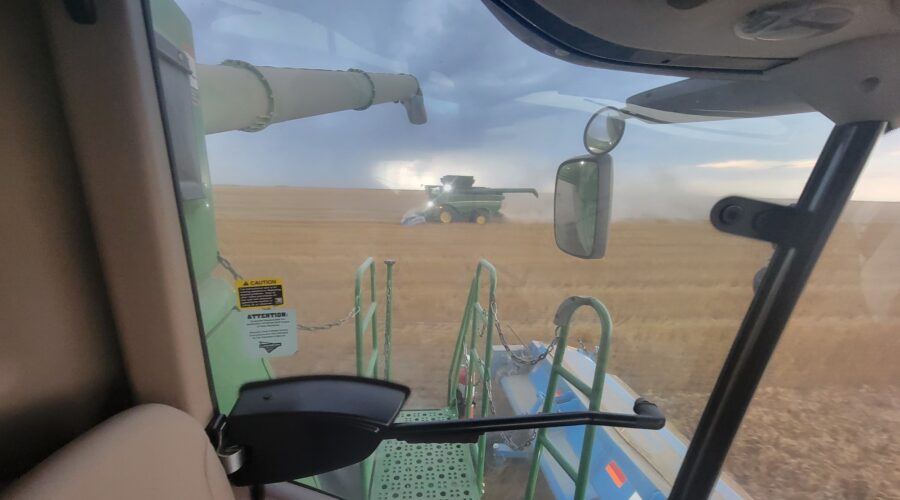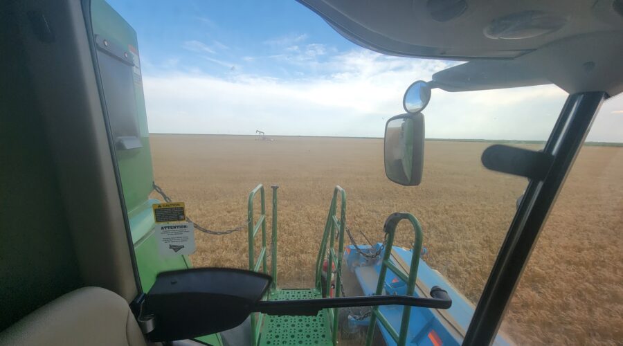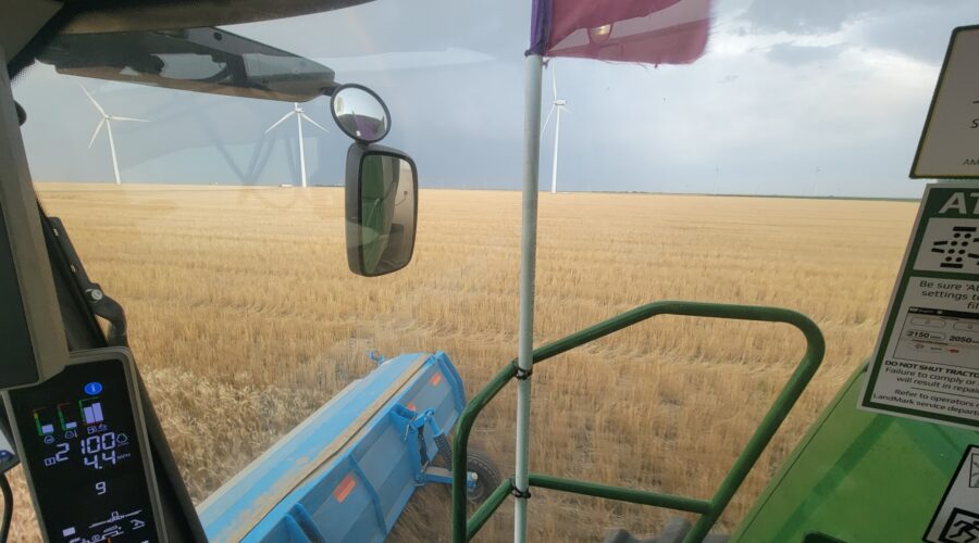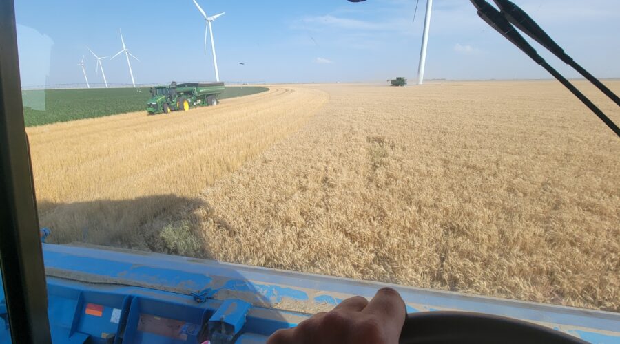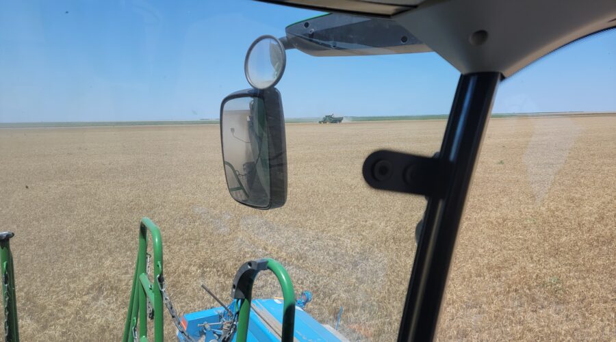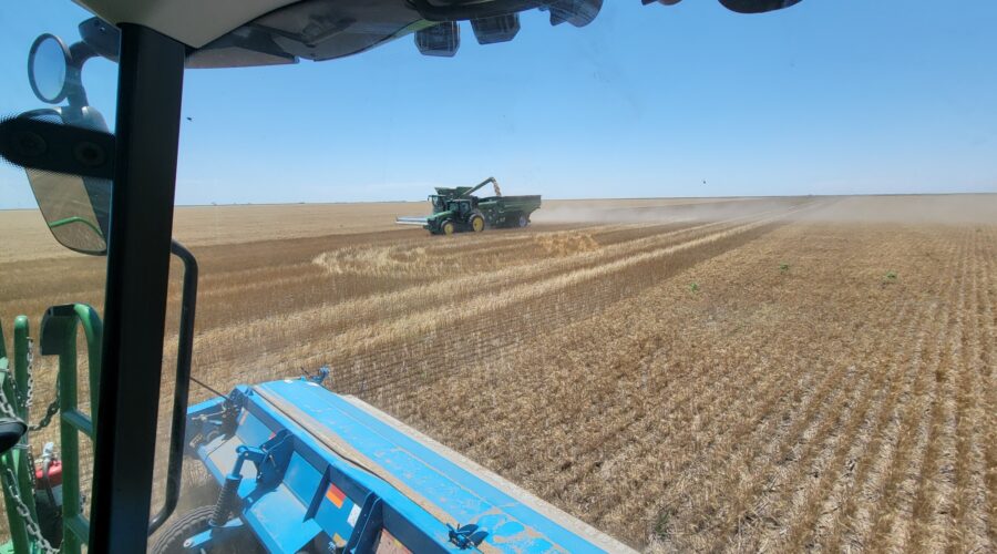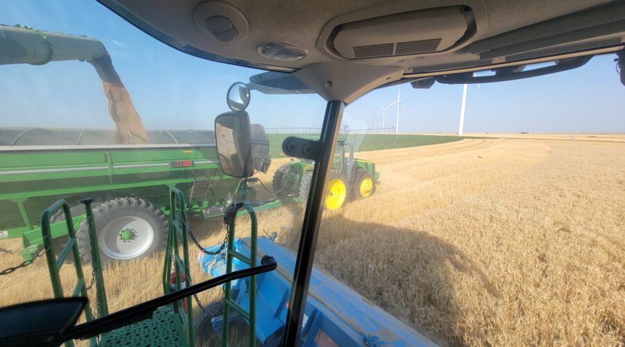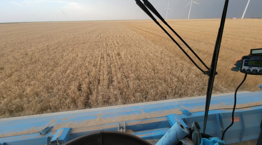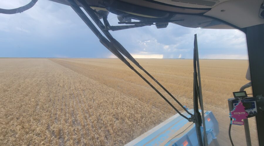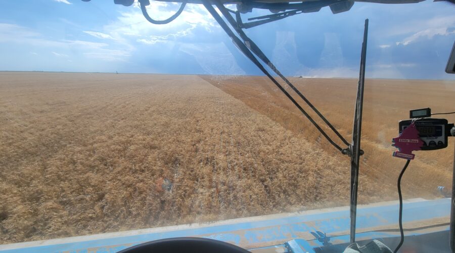 Western Kansas—We are getting over some acres. We have no mud here and good irrigated wheat to cut so really it doesn’t get any better than that. However, rain showers mess up our days. Sampling isn’t any fun. Trying to find dry wheat is a job too.