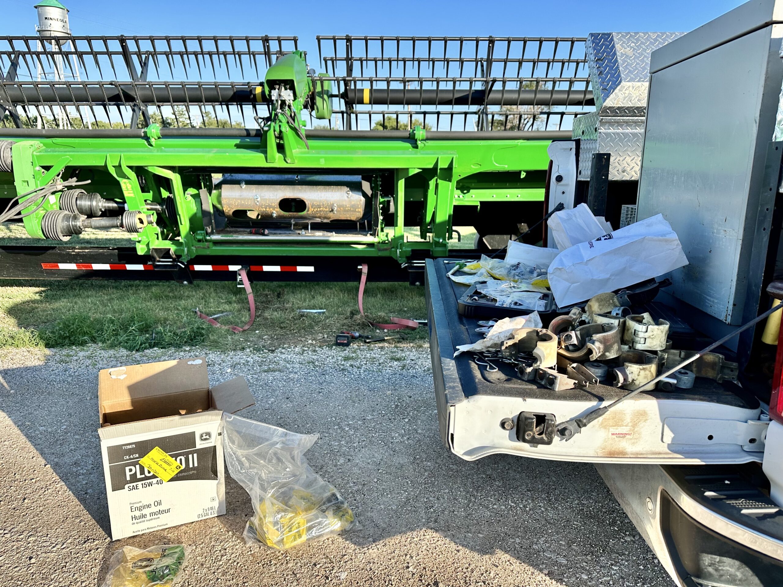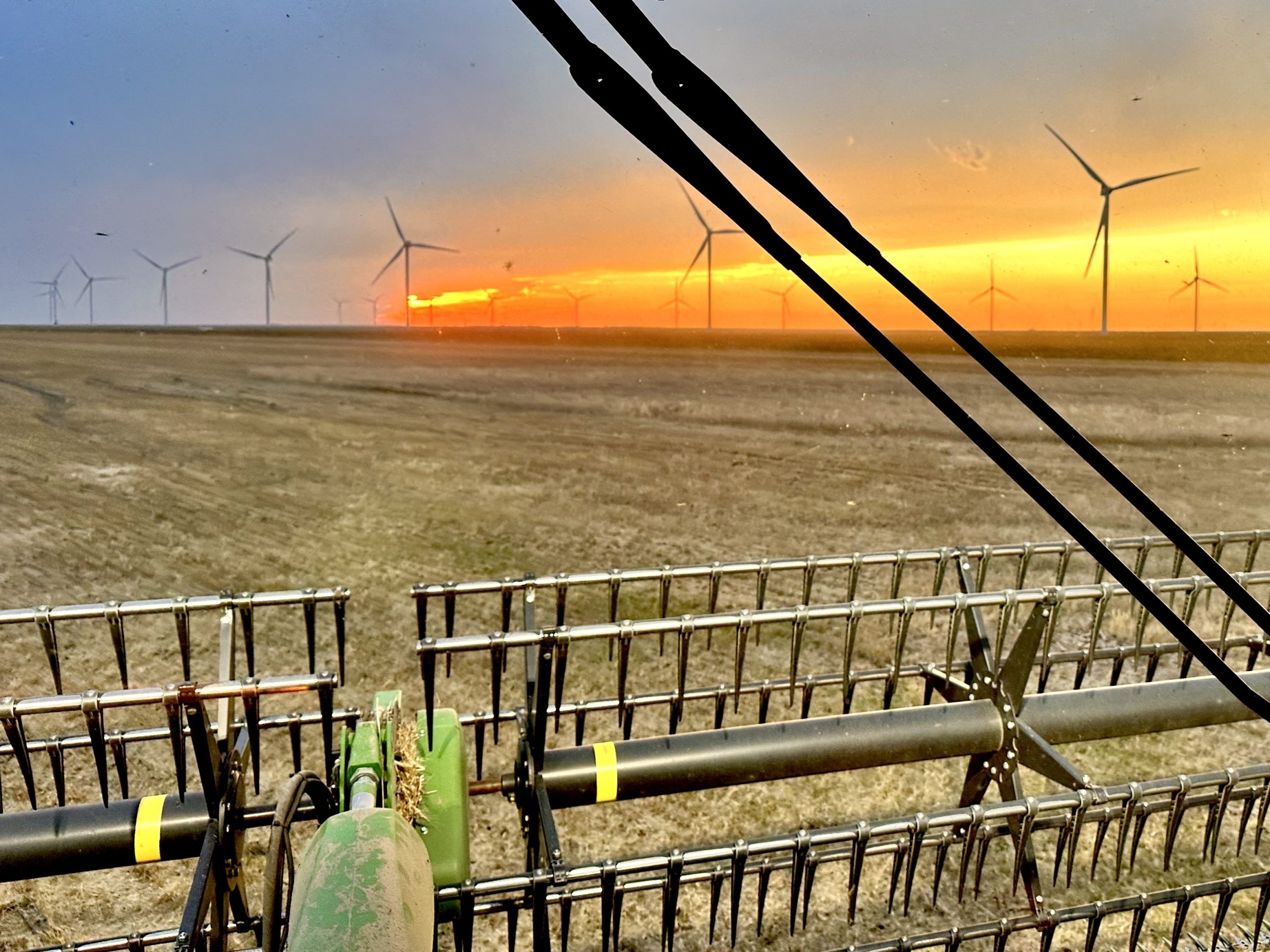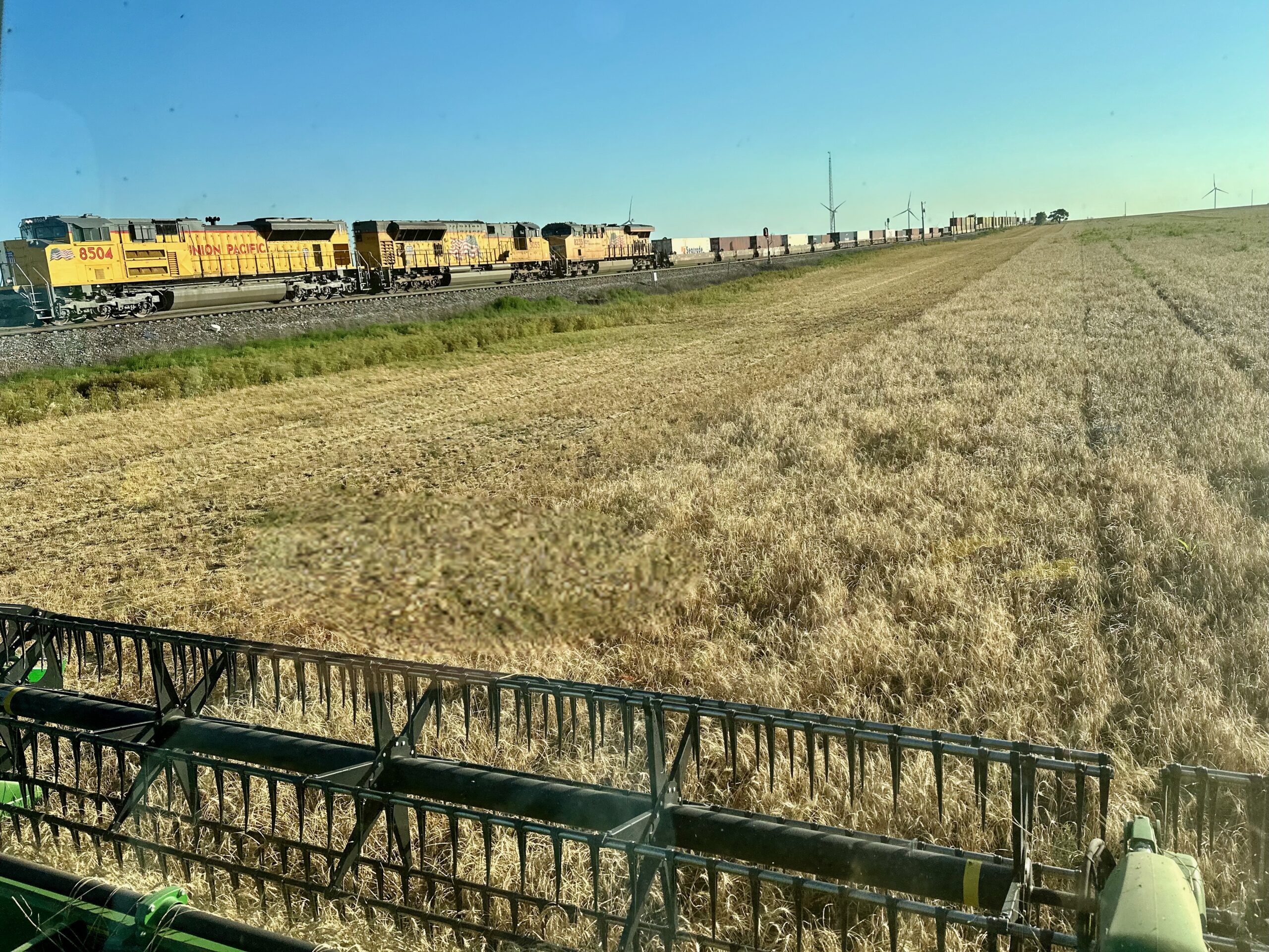 After tens of millions of revolutions, the draper head’s auger fingers get new guides and hardware installed. In Kansas we find ourselves often harvesting alongside trains and turbines.