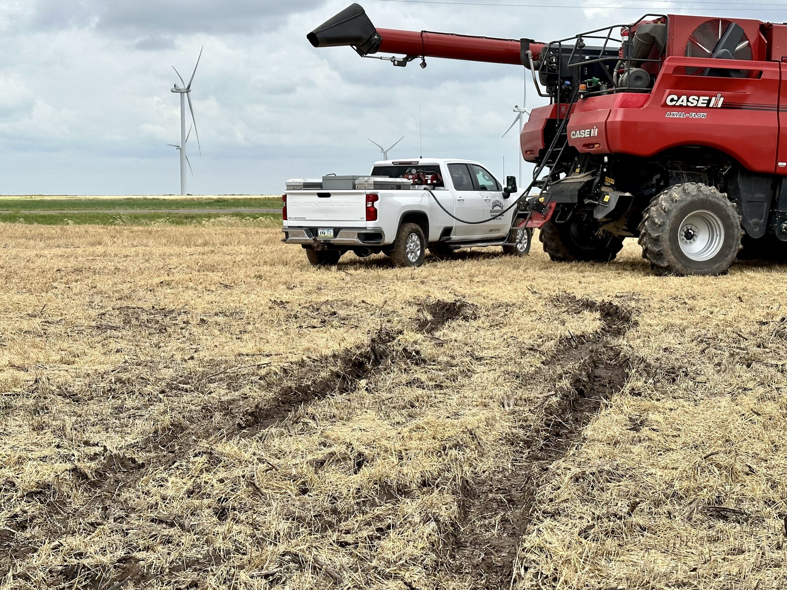 The fields are too wet for the semis, and even fueling the combines with the pickup requires 4×4 and a little luck. Water along the ditches and ponds in the fields mean some areas will never be harvested.