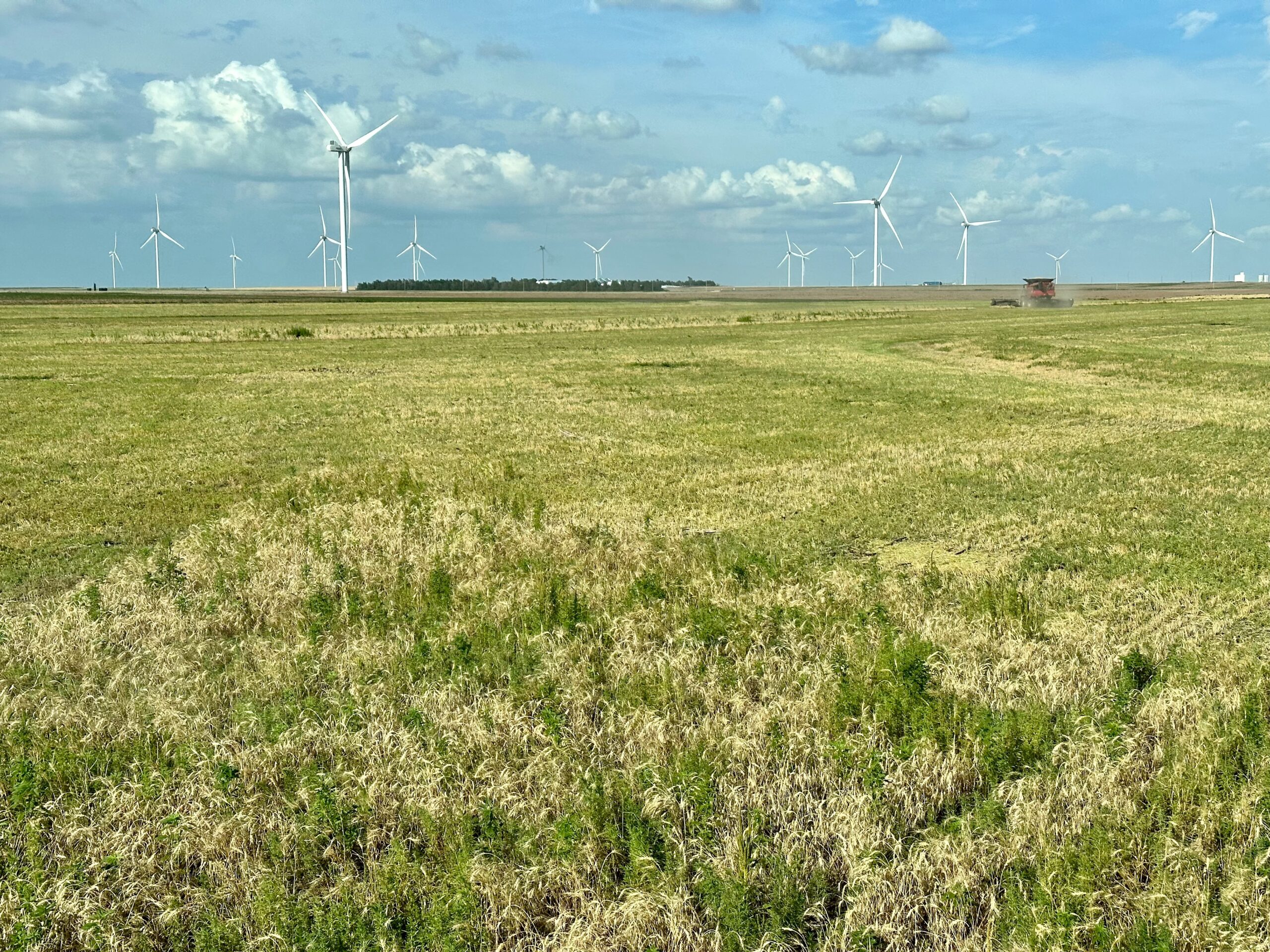 Minneola, Kansas—After twelve days of going stir crazy staring at the clock, we finally have started harvesting in Kansas … and it’s about time. This weather pattern is so unusual even the locals can’t recall another summer quite like this. Known for triple-digit heat and single-digit humidity, Kansas has instead given us foggy mornings and cloudy skies. The gale force winds that usually blow your hat off and into the next county have been light and variable, and even a few sprinkles on our tin roof have served as an alarm clock a few times this week.
